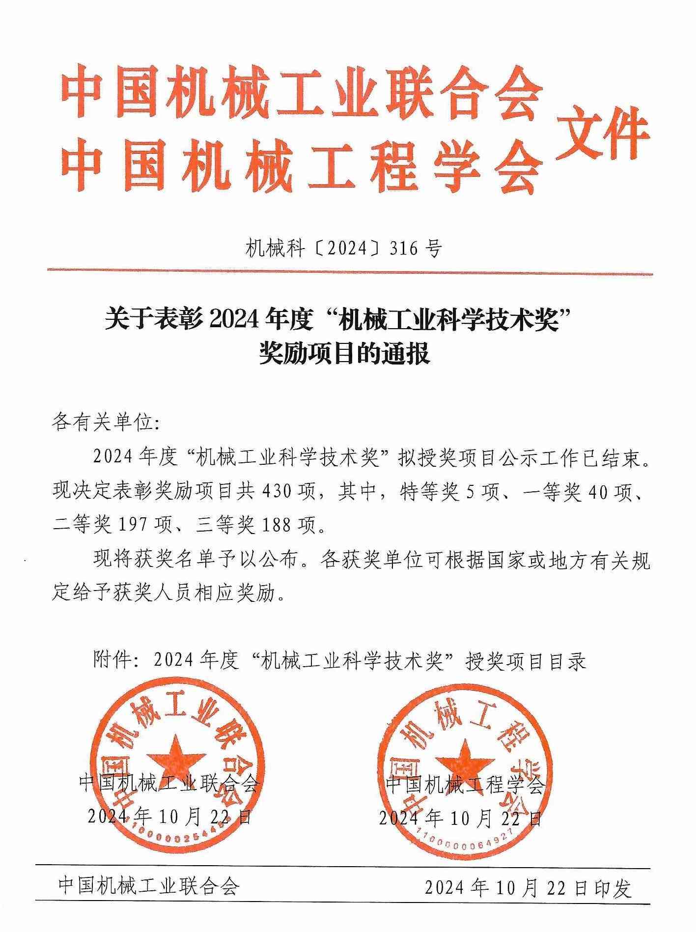 關(guān)于表彰2024年度“機(jī)械工業(yè)科學(xué)技術(shù)獎(jiǎng)”獎(jiǎng)勵(lì)項(xiàng)目的通報(bào)
