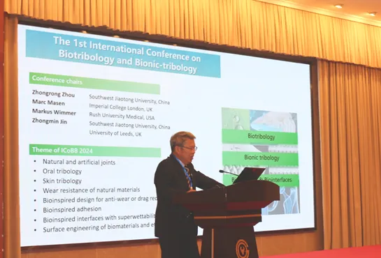 2024年9月11-13日,第一屆生物與仿生摩擦學(xué)國際會議(International Conference on Biotribology and Bionic-tribology, ICoBB)在四川成都成功舉辦。此次會議由中國機(jī)械工程學(xué)會摩擦學(xué)分會主辦,西南交通大學(xué)、《Biosurface and Biotribology》期刊承辦,會議由西南交通大學(xué)周仲榮教授、帝國理工Marc Masen教授、美國拉什大學(xué)醫(yī)學(xué)中心Wimmer教授和西南交通大學(xué)/利茲大學(xué)靳忠民教授聯(lián)席主持本次會議,中國機(jī)械工程學(xué)會摩擦學(xué)分會主任委員周仲榮教授代表分會致開幕詞。